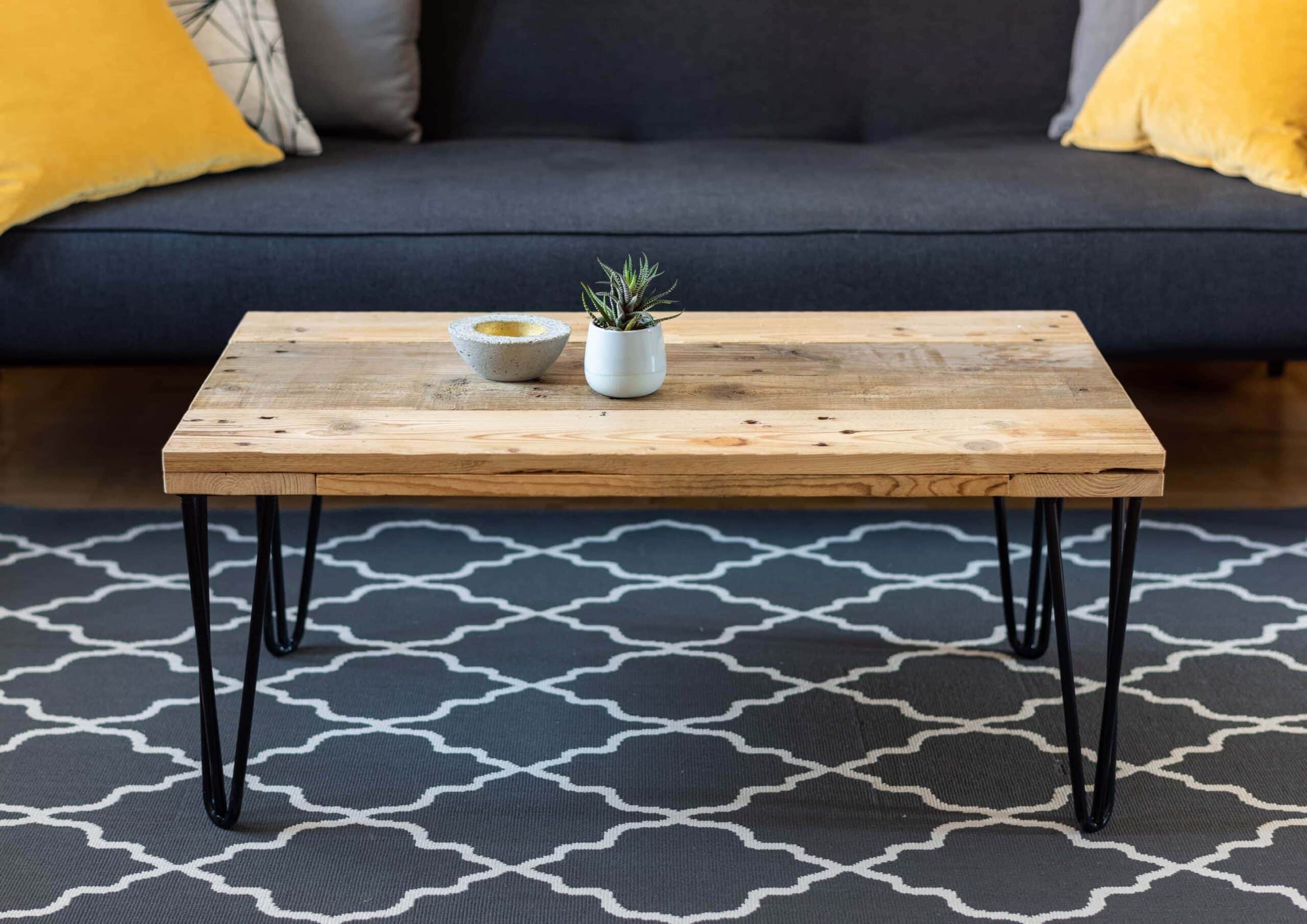 Dieser Sofatisch mit den absolut angesagten Hairpin Beinen sticht hervor in Eleganz und doch einem rustikale Design. Schlichtheit und Exklusivität kommen zusammen, wie sich auch das Metall und Holz in ein stimmiges Bild fügen. Die upcycelten Holzbretter werden spezifisch für den Tisch ausgewählt, wodurch jedes Möbel zum Einzelstück wird.